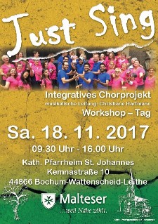 Singen ist bunt. Singen verbindet. Singen kann ausdrücken, was Worte oft nicht sagen können. Ob als Kind oder Senior – jeder Mensch hat das Recht darauf, die eigene Singstimme zum Klingen zu bringen – und in guter Gemeinschaft ist´s nun mal besonders schön. Und da im gesamten Ruhrgebiet nun mal eine bunte Mischung aus alt-eingesessenen Bio – Ruhrpottlern und solchen, die erst seit kurzer Zeit dazu gehören, leben, ist es an der Zeit, sich besser kennen zu lernen. Ob beim Sport, in der Kunst oder durch Musik – die Kultur eignet sich am besten, Brücken zu bauen und Trennendes zu überwinden. Mit Geflüchteten und Menschen, denen Vielfalt lieber ist als Einfalt und die Spaß am Singen, entstand das Chorprojekt „Just Sing!“, um Menschen zu verbinden, Ängste und Hemmungen abbauen zu helfen und zur Integration von Geflüchteten beizutragen. Die katholische Gemeinde St. Johannes, die schon länger ehrenamtlich in der Flüchtlingsarbeit unterwegs ist, und der Malteser Hilfsdienst, der die Flüchtlingsunterkunft an der Emil-Weitz-Straße in Wattenscheid betreut und dort integrative Arbeit leistet, starteten das Chorprojekt gemeinsam.