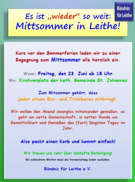 Und vielleicht schon mal vormerken: Am 13. Oktober veranstaltet der „Leither Bürgertreff“ wieder ein offenes Grillen an den beiden Vesperecken.
