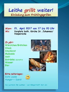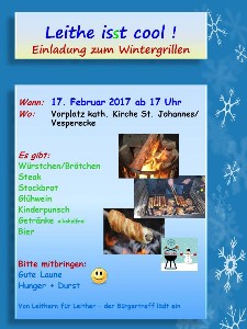 Fr 17.02.2017, 17:00-20:00 Uhr „Angrillen“ LEITHE IS(S)T COOL des Leither Bürgertreffs auf dem Kirchenvorplatz St. Johannes