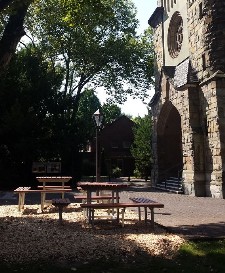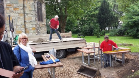 Über die Sommerferien konnte unser Projekt "Zweite Vesperecke" in Angriff genommen und realisiert werden. Mit vereinten Kräften finanzieller und körperlicher Art konnten wir die viel genutzte Möglichkeit der Begegnung vor unserer Kirche erweitern. Die vergrößerte Sitzgruppe lädt zwischen Kirche und Bücherschrank unter Bäumem zum Plausch, zum Treffen, zum Essen für alle ein und bietet eine schöne Möglichkeit, sich zum Beispiel nach Taizè - Gebeten noch auszutauschen. Ein DANKE an alle, die das ermöglicht haben.