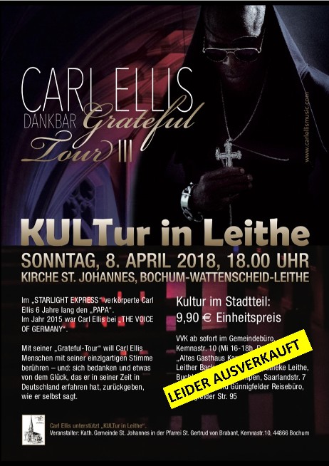 Im Rahmen der Veranstaltungsreihe KULTur in Leithe war am Sonntag, 8. April 2018 um 18 Uhr der aus dem Musical „Starlight Express“ und durch „The Voice of Germany“ bekannte Sänger Carl Ellis in unserer St. Johannes - KIrche zu Gast. Mit seiner „Grateful-Tour“, die ihn derzeit quer durch Deutschland führt, will Carl Ellis Menschen mit seiner einzigartigen Stimme berühren – und: sich bedanken und etwas von dem Glück, das er in seiner Zeit in Deutschland erfahren hat, zurückgeben, wie er selbst sagt.