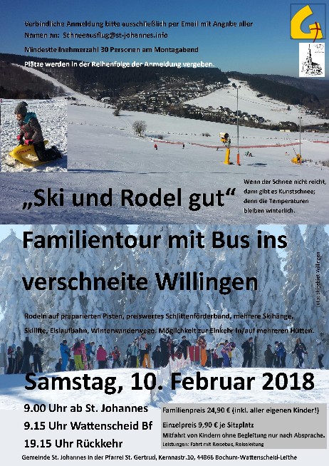Wie im letzten Jahr haben wir auch dieses Mal wieder einen Familienausflug nach Willingen im Hochsauerland angeboten, dieses Mal mit zusätzlicher Zustiegsmöglichkeit am Wattenscheider Bahnhof für unsere Nachbargemeinden. Und dank einer soliden Grundlage, rund 10 cm Neuschnee und einigen Schneekanonen präsentierte sich uns eine weiße Landschaft. Zur Begrüßung schien die Sonne und alle Pisten und Rodelbahnen waren präpariert. Rund 50 Teilnehmer, überwiegend Familien, hatten Schnee "satt", es gab Rodelwettkämpfe, Stunt - Fotos, Pisten - Abfahrten und Winterwanderungen. Und zwischendurch oder am Ende hatten alle die Möglichkeit, echten "Hüttenzauber" zu erleben. Und dann freuten sich aber alle auch wieder auf einen warmen Bus! Ein toller Wintertag!