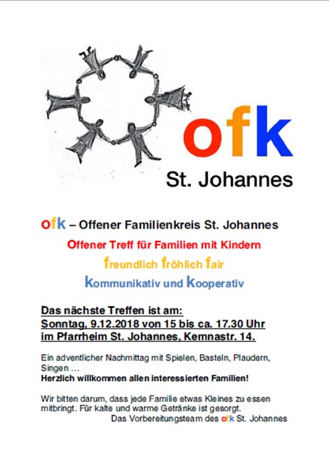 Zum nächsten offenen Familientreff in St. Johannes sind interessierte Familien mit Kindern herzlich eingeladen. Es soll ein gemütlicher, kreativer, stimmungsvoller adventlicher Nachmittag werden mit Singen, Spielen, Basteln, Plaudern, adventlichen Gedanken und Ideen. Einfach hinkommen, andere Familien treffen, gemeinsam Spaß haben! Wir bitten darum, dass jede Familie etwas Kleines zum Essen mitbringt. Für kalte und warme Getränke ist gesorgt. Wir freuen uns auf Sie und euch: das Vorbereitungsteam des ofk St. Johannes