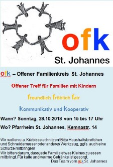 Zum zweiten offenen Familientreff kurz vor Halloween und Allerheiligen luden Familien aus St. Johannes wieder andere interessierte Familien mit kleinen und großen Kindern zum Spielen, Singen, Plaudern, geselligen Beisammensein, Essen und Trinken ein. Dieses Mal haben wir unter anderem Kürbisse geschnitzt (und sind auch der Frage nachgegangen, was Halloween mit Allerheiligen zu tun hat …). Das Angebot des Offenen Familienkreises ist aus der diesjährigen Kommunionvorbereitung in St. Johannes entstanden. Es ist ein offenes Angebot für alle Familien, die kommen wollen – egal, ob regelmäßig oder nur ab und zu mal, etwa alle 6-8 Wochen sonntagsnachmittags im Pfarrheim St. Johannes, Kemnastr. 14 (Eingang gegenüber der Arztpraxis Dr. Altgassen/Zamhöfer/Probst).