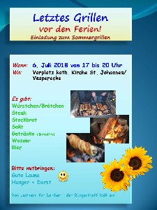 Der Leither Bürgertreff lädt gemeinsam mit der Gemeinde St. Johannes am 6. Juli ab 17 Uhr zum Sommer-Grillen vor den Ferien auf dem Kirchenvorplatz ein.
