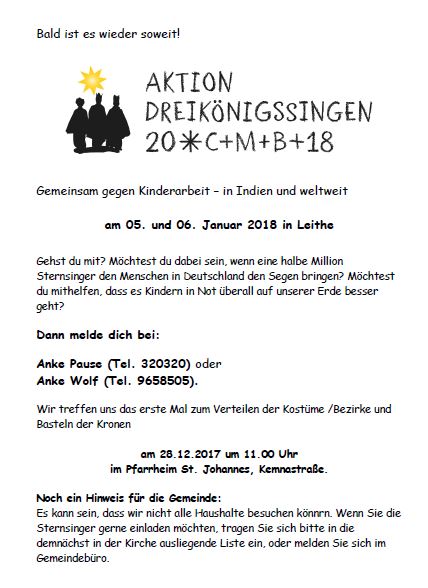 Es gibt ein Treffen am Donnerstag, 28.12.2017, von 11-12.30 Uhr im Pfarrheim. Hierzu laden wir alle Kinder, Jugendlichen und Erwachsenen ein, die mitmachen wollen (und auch alle, die erst mal gucken wollen und sich noch nicht sicher sind). An diesem Tag gibt es alle wichtigen Infos, außerdem zeigen wir einen Film über die Aktion. Die Kinder basteln ihre Königskronen und bekommen ihre Königsgewänder. Ab 12.30 Uhr können die Kinder abgeholt werden oder selbst nach Hause gehen. Die HelferInnen bitten wir, dann noch etwas zu bleiben, damit wir noch Absprachen treffen können.