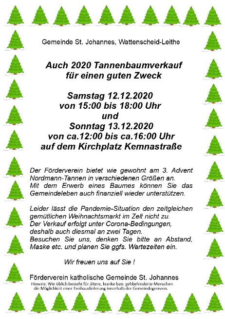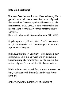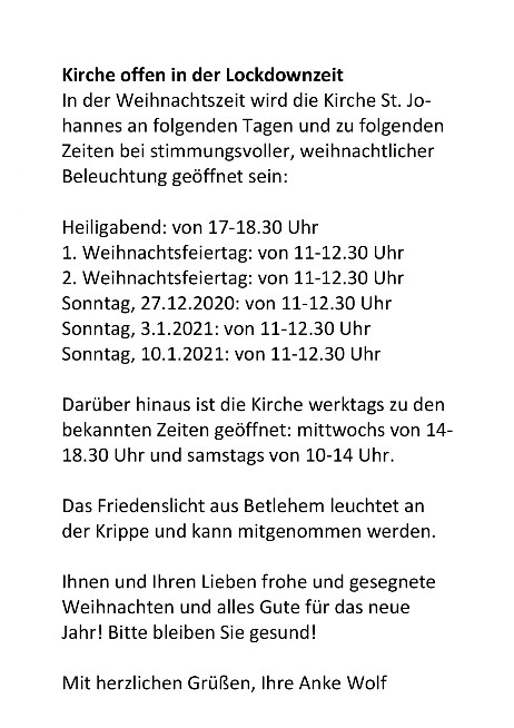 Im Anschluss an den Gottesdienst in St. Johannes am 13.12.2020 ist die Kirche, im Zuge der "Tannenbaumaktion", für Einkehr und stilles Gebet bis ca. 16 Uhr geöffnet. Pastoral Mitarbeitende sowie Mitglieder des Gemeinderates sind vor Ort anwesend und sind ansprechbar, auch zu diesem Thema.