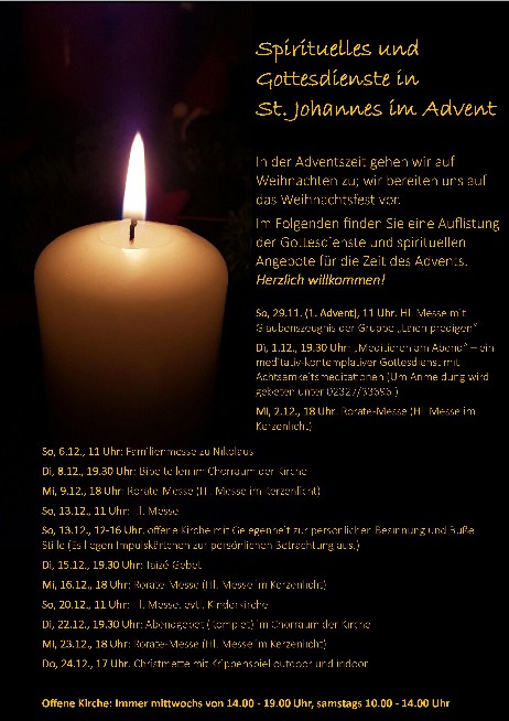 Offene Kirche St. Johannes: Einkehren, Verweilen, Ausruhen, Gott nah sein - mittwochs von 14.00 bis 19.00 Uhr und samstags von 10.00 - 14.00 Uhr und neu sonntags von 10.30 - 12.00 Uhr. Sie sind herzlich eingeladen, zu kommen, in der Kirche zu verweilen, zu beten, Lichter zu entzünden. HERZLICHE EINLADUNG!