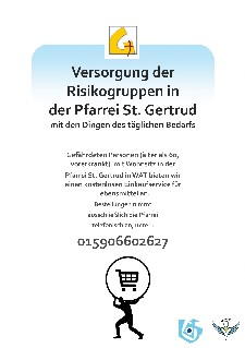 Jugendliche aus der Pfarrei, vor allem aus der KJG und der Messdienerschaft, haben unterstützt von unserer Freiwilligenmanagerin Alexandra Schroer und unserer Jugendbeauftragten Christina Scholze eine Einkaufshilfe organisiert, insbesondere für Senioren, aber auch andere durch das Corona-Virus besonders gefährdete Personen. Hinweise auf dem Flyer. Anruf genügt. Nun ist gerade die Zielgruppe zwar manchmal überraschend gut, aber eben oft auch kaum im Internet unterwegs. Daher helfen Sie, hilf Du, bitte mit, diese Information zu verbreiten. Durch Klick kann der Flyer als pdf heruntergeladen werden.