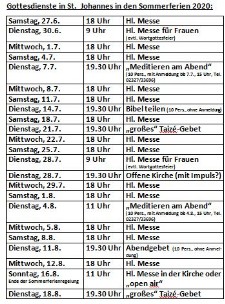 in den Sommerferien feiern wir wieder samstagsabends um 18 Uhr Hl. Messe, außerdem mittwochsabends um 18 Uhr und dienstagsabends um 19.30 Uhr eine Wortgottesfeier (s. Gottesdienstplan). Am letzten Dienstag im Monat findet um 9 Uhr Frauengottesdienst statt. Alle Gottesdienste in den Ferien finden in der Kirche statt.