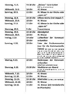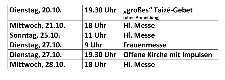 • An jedem Dienstag ist um 19.30 Uhr eine Wortgottesfeier. Die Form variiert: Wortgottesfeier/Meditation/offene Kirche mit Impul-sen/Bibelteilen/Abendgebet/Taizé-Gottesdienst