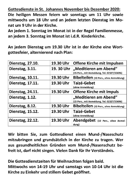 Dies war der vorerst letzte Präsenzgottesdienst! Alle Präsenzgottesdienster in der Pfarrei entfallen bis 10. Januar. Bitte beachten Sie, beachte Du, unsere Angebote online und "to go". Die Kirche ist vielfach geöffnet (s.u.).