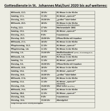 Ab Mitte Mai 2020 werden in St. Johannes wieder Gottesdienste angeboten. In der Kirche können wir unter den derzeit vorgegebenen Bedingungen ca. 40 Sitzplätze einrichten. Wir probieren, den Gottesdienst sonntags draußen zu feiern, auf der Wiese am barrierefreien Eingang der Kirche. Dort können mehr Sitzplätze eingerichtet werden, auch für Familien mit Kindern. Evtl. kann dann auch ab und zu draußen Kinderkirche stattfinden. Alle anderen Gottesdienste finden in der Kirche statt.