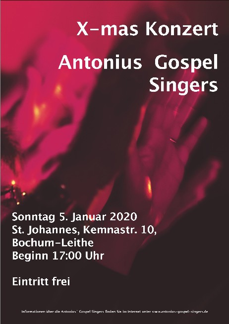 Die Antonius Gospel Singers aus Gelsenkirchen geben im Rahmen der Veranstaltungsrehe KULTur in Leithe in der Kirche St. Johannes ein weihnachtliches Gospelkonzert. Der Eintritt ist frei; über eine Spende freuen sich die Sängerinnen und Sänger. KULTur in Leithe ist eine Veranstaltungsreihe der katholischen Gemeinde St. Johannes mit dem Ziel, vielfältige kulturelle Angebote ortsnah und frei bzw. günstig anzubieten. In der Pause werden Schnittchen und Getränke auf Spendenbasis gereicht.