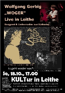 Endlich wieder KULTur in Leithe, wenngleich unter besonderen Bedingungen! Wolfgang Gerbig alias WOGER kam aus Südbaden zu uns! Geplant in der Sommerzeit der "Lockerung", durchgeführt unter schon wieder strengeren Reglementierungen kurz vor dem "lockdown light", der für Kultur ein richtiger "lockdown" ist, erlebten wir bewegende Texte, mal einfühlsame, mal mitreißende Musik, von Hand gemacht! "Aus der Seele": Ein Konzert wie eine Predigt!