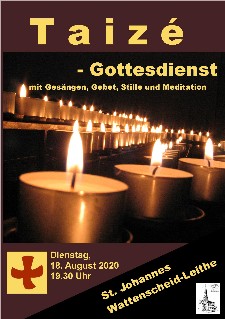 Zum nächsten „großen“ Taizé-Gebet laden wir wieder herzlich ein: am Dienstag, 21. Juli, um 19.30 Uhr. Die schönen, meditativen Gesänge aus Taizé - jetzt auch wieder zum (zurückhaltenden) Mitsingen -, begleitet und getragen von Gitarre, Keyboard und Flöten, wollen dabei helfen, die Unruhe des Tages loszulassen und zur Ruhe zu kommen. Im Licht vieler Kerzen hören wir das Wort Gottes und stellen Lichter für ganz persönliche Anliegen auf. Taizé-Gottesdienste sind ökumenisch ausgerichtet. Sie orientieren sich am Beispiel der Gottesdienste, die in der ökumenischen Gemeinschaft der Brüder in Taizé in Burgund, Frankreich, stattfinden.