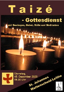 In unserer Kirche ist am Dienstag, 15.12., um 19.30 Uhr wieder Taizé-Gebet. In adventlicher Atmosphäre bei vielen Kerzenlichtern zur Ruhe kommen und im biblischen Wort, im Gebet, in der Stille und in den meditativen Gesängen aus Taizé auftanken. Ein Licht aufstellen für persönliche Anliegen.