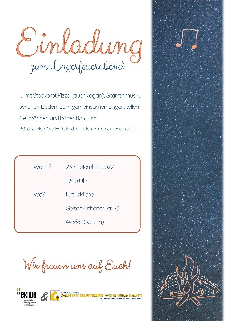 Die evangelische und die katholische Kirche in Wattenscheid laden zum ökumenischen Miteinander mit Singen, Plaudern, Pizzaessen und Stockbrotbacken am Lagerfeuer an der evangelischen Kreuzkirche in Leithe ein. Alle, die kommen möchten, sind herzlich willkommen!