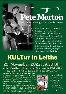 Musik von den Britischen Inseln in Leithe: Pete Morton war bei "KULTur in Leithe" und spielte im Alten Gasthaus Kampmann. Alle Gäste im gut gefüllten Saal hatten viel Freude am breiten Spektrum seiner Musik und konnten sogar einen Saitenwechsel an der Gitarre bei laufendem Gesang erleben...