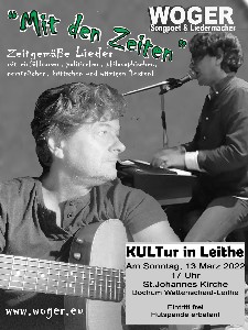Der Liedermacher und Songpoet WOGER lebt im südbadischen Markgräflerland und tourt mit seinem Programm mittlerweile durch ganz Deutschland. Am Sonntag, 13. März 2022 gastierte WOGER mit seinem Programm „Mit den Zeiten“ im Rahmen der Reihe „KULTur in Leithe“ in der St. Johannes Kirche in Bochum Wattenscheid-Leithe. Bewegende Lieder begeisterten am Sonntagnachmittag.