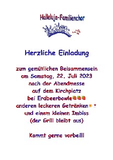 Einer der Beiträge gegen das "Sommerloch": "Wir vom Halleluja Familienchor möchten Sie auch in diesem Jahr einladen, nach der Samstags-Messe noch zu einem kleinen Dämmerschoppen auf dem Kirchplatz zu verweilen. Als Termin haben wir uns Samstag, den 22. Juli 2023 ausgesucht. Wir freuen uns auf Euch!"