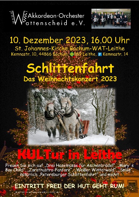 Erneut ist das Akkordeon-Orchester Wattenscheid zu Gast bei KULTur in Leithe - nun zu einem vorweihnachtlichen Konzert. Alle Gäste dürfen sich nwieder auf ein abwechslungsreiches Programm freuen! Der Eintritt ist frei - am Ende "geht der Hut rum".