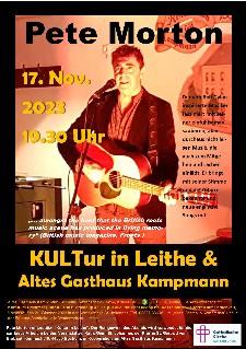 Am 17. November um 19.30 Uhr gibt es wieder Musik von den Britischen Inseln: Pete Morton kommt noch einmal zu uns. Im letzten Jahr faszinierte er schon mit seiner einfühlsamen, sauberen, aber durchaus nicht leisen Musik, die auch zum Mitgehen und Lachen einlädt. Er bringt mit seiner Stimme und der Gitarre bekannte und neue englische Songs mit.