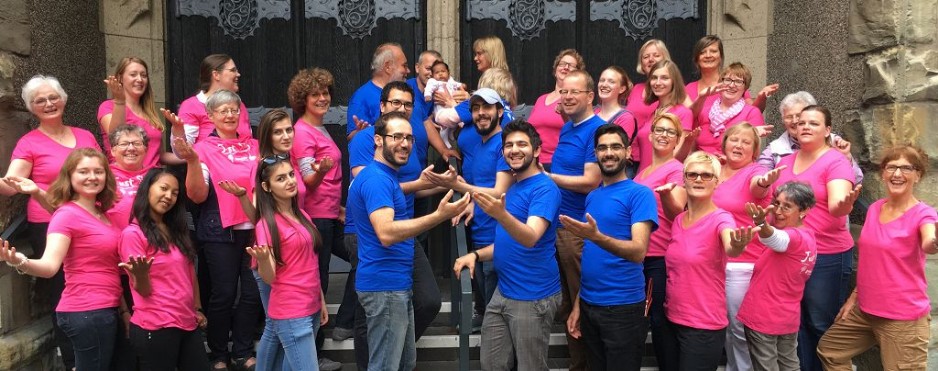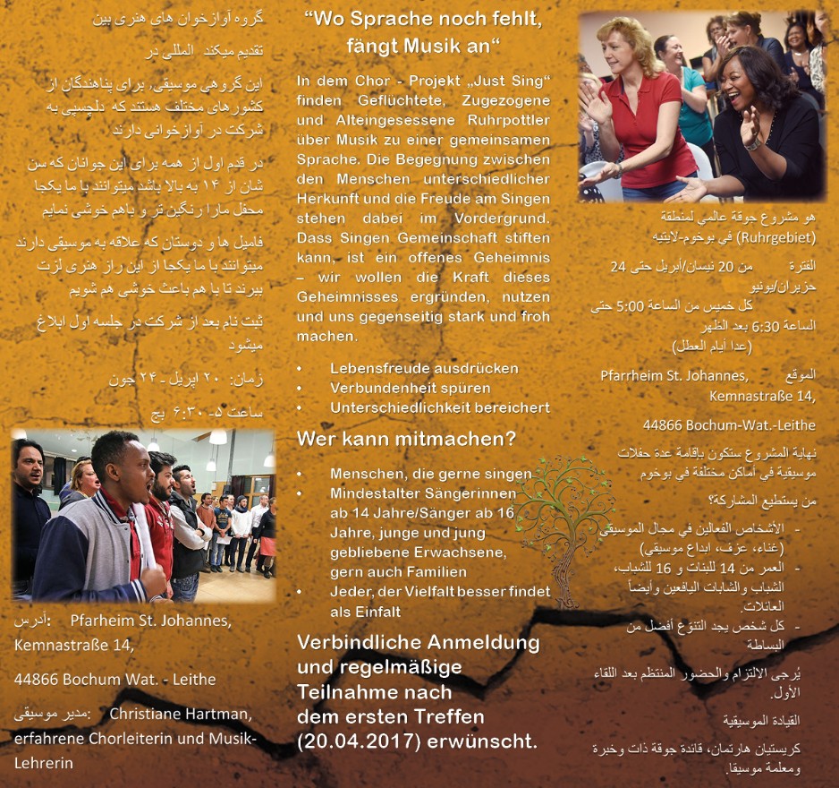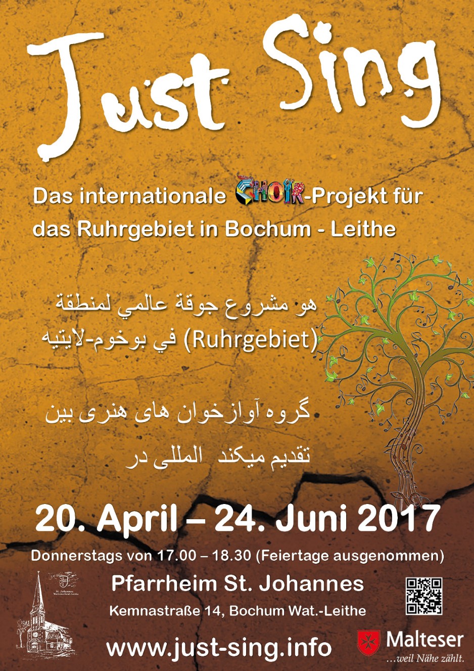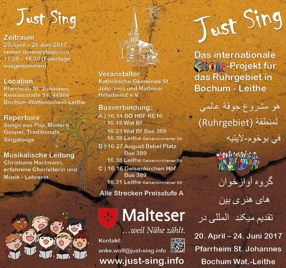 Dass Singen Grenzen überwinden, ganz unterschiedliche Menschen völlig unkompliziert zusammenführen, dass es außerdem unglaublich viel Spaß machen und gut tun kann – das durften diejenigen erfahren, die beim Projektchor „Just Sing!“ im Frühjahr 2017 mitgemacht haben. Ziel des Projektes, das die Gemeinde St. Johannes gemeinsam mit dem Malteser Hilfsdienst e.V. veranstaltet und durchgeführt hat, war es, Geflüchtete und Einheimische miteinander in Kontakt zu bringen. Menschen ganz unterschiedlicher Herkunft haben mitgemacht. Es sind Beziehungen und auch Freundschaften entstanden. Hier und da konnte wirksam Hilfe zur Integration geleistet werden – etwa durch Hilfe bei Übersetzungen, bei amtlichen Vorgängen, bei Wohnraumsuche und -einrichtung und durch Vermittlung von Praktikumsplätzen.